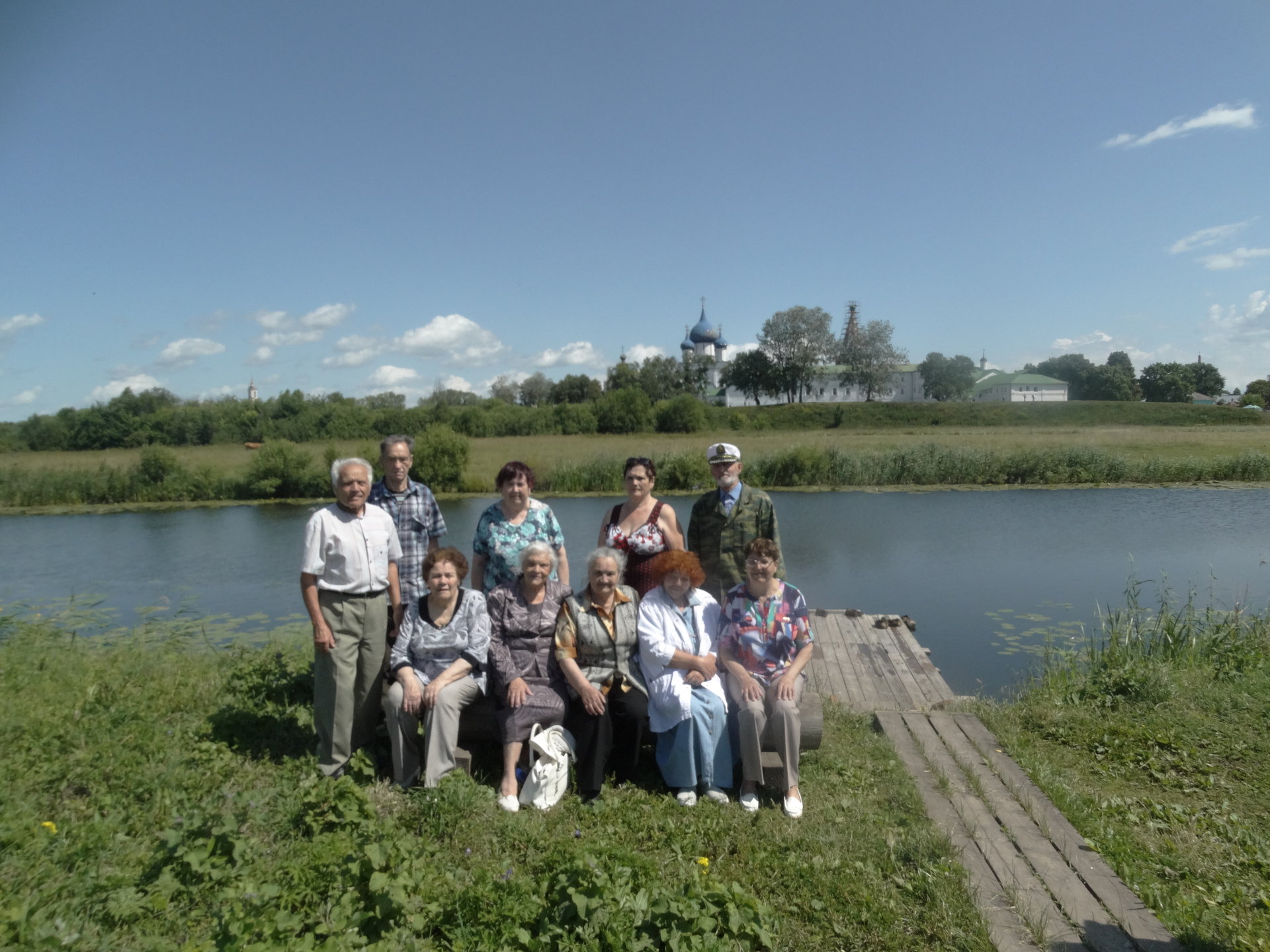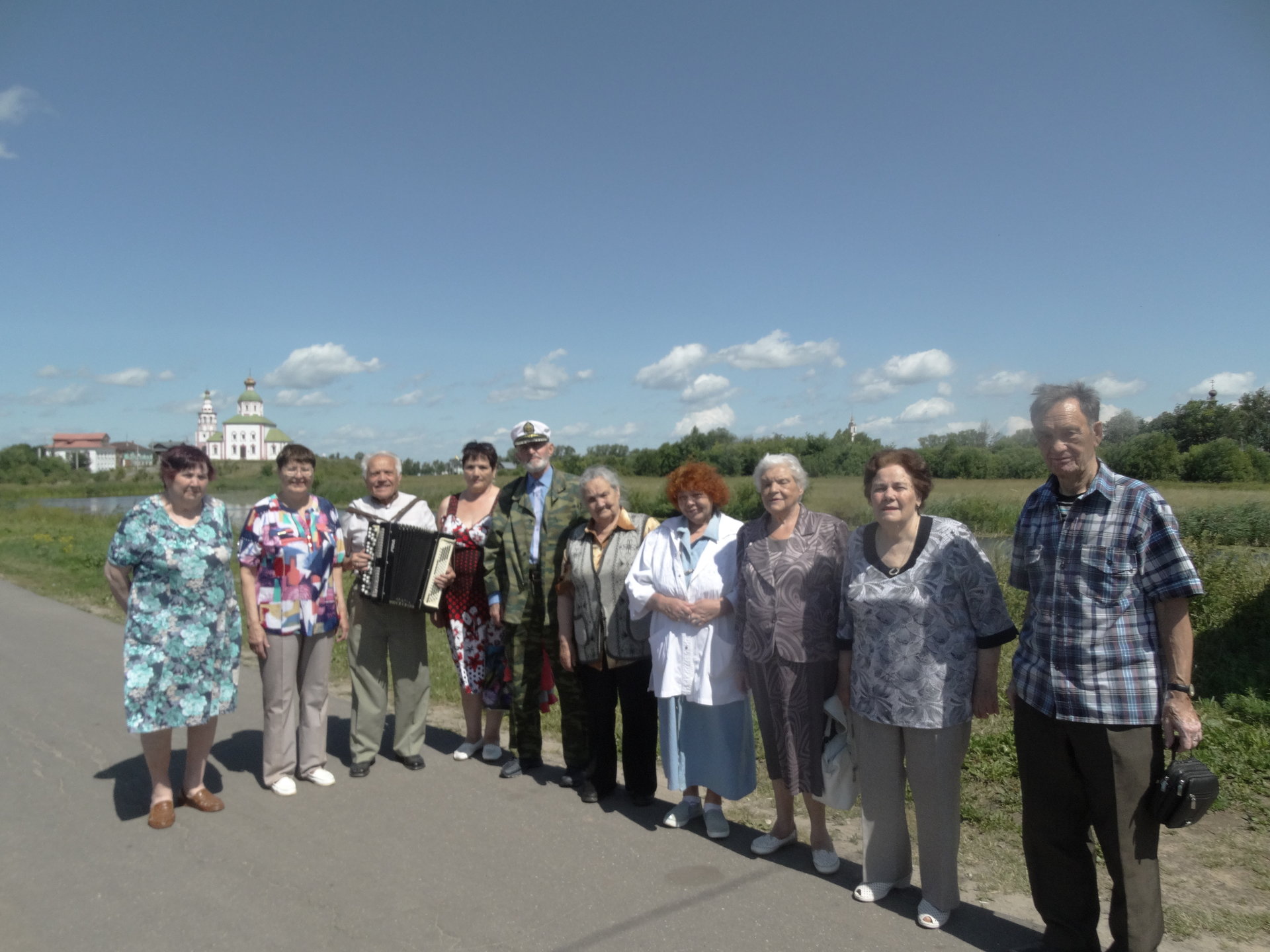 Возвращаясь на тот же причал у Музея деревянного зодчества, участники путешествия весело и с задором исполняли всеми любимые песни под баян Андреева Евгения Ивановича, еще раз любуясь Суздалем.